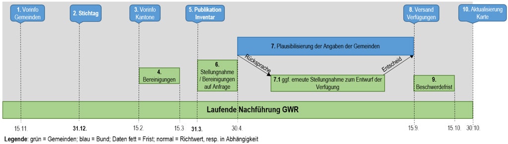 Die Gemeinden sind verpflichtet, ein Wohnungsinventar zu erstellen, auf dessen Grundlage der Zweitwohnungsanteil berechnet werden kann. Diese Anforderung wird erfüllt, indem jede Gemeinde ihre Wohnungen im Gebäude- und Wohnungsregister (GWR) erfasst. Die Gemeinden müssen mindestens die Gesamtzahl aller Wohnungen aufführen und können freiwillig die den Erstwohnungen gleichgestellten Wohnungen ausweisen. Mit einer laufenden Nachführung des GWR können die Gemeinden nachträgliche Bereinigungen des Wohnungsinventars vermeiden. Es ist sehr wichtig, dass die Daten des GWR und der Einwohnerkontrolle vollständig erfasst werden, ansonsten können die Erstwohnungen vom BFS nicht zuverlässig identifiziert werden und sie müssen zu den Zweitwohnungen gezählt werden. Eine manuelle Erfassung der Erstwohnungen oder eine nachträgliche Bereinigung von Erstwohnungen sind nicht möglich. Die Gemeinden bewirtschaften ihre Daten im eidgenössischen GWR (www.housing-stat.ch). In einigen Kantonen wird das GWR vom Kanton bewirtschaftet. Das Monitoring-Tool Delimo gibt Aufschluss über die Qualität der Datenlieferung.