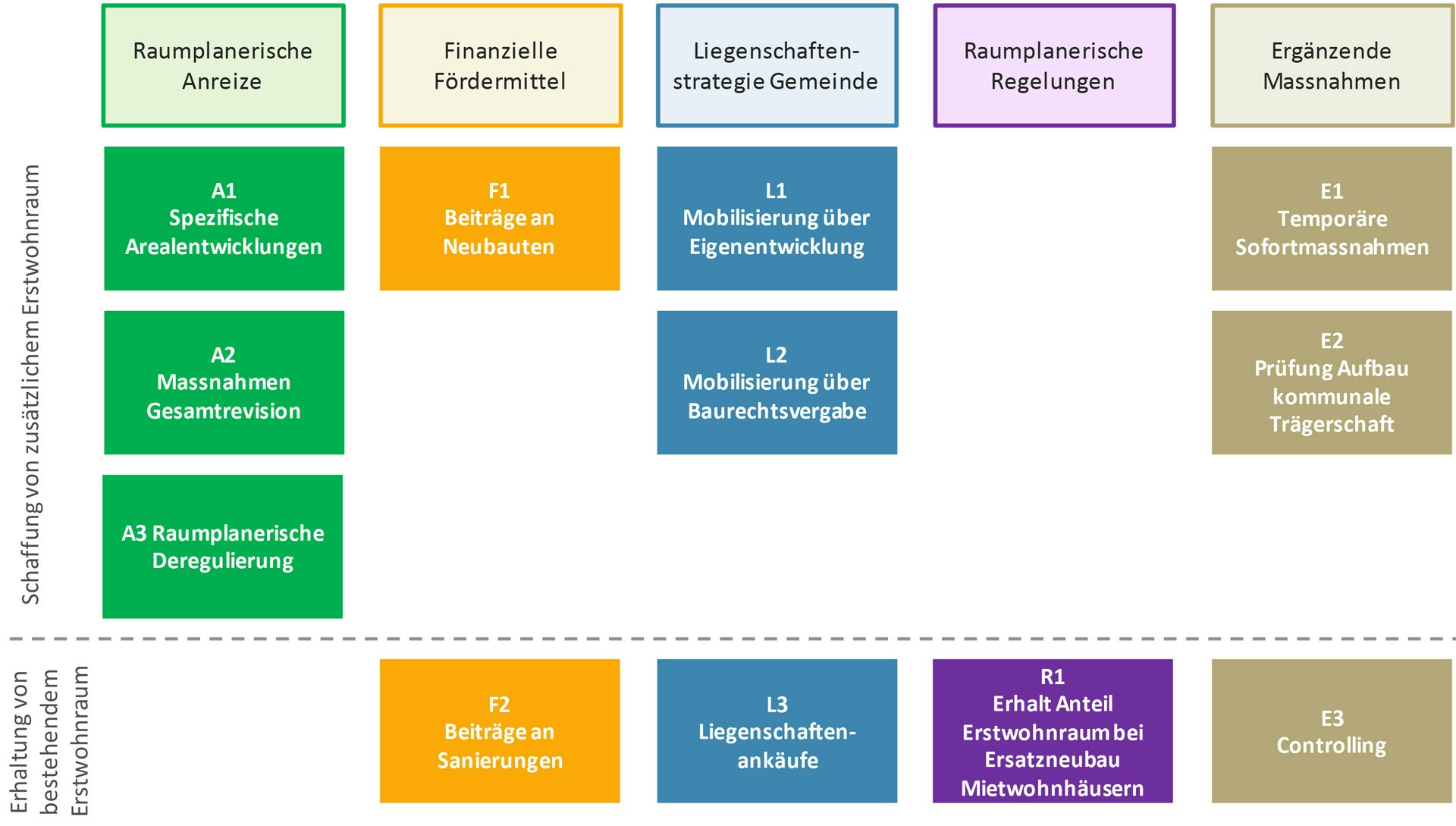 - Raumplanerische Massnahmen über Anreize wie Zuschläge/Privilegien bei Erstwohnungsanteilen, Zonenbestimmungen mit Erstwohnanteilen oder Nutzungsdichten, Arbeiterwohnungen bei neuen Hotels / touristisch bewirtschafteten Wohnungen, Einführung einer Sondernutzungsplanungspflicht.