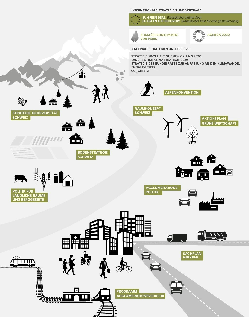 Damit die Schweiz bis 2050 klimaneutral sein wird, will das ARE nicht nur zur Anpassung an den Klimawandel beitragen, sondern auch einen Beitrag zum Klimaschutz leisten. Mit etlichen Programmen und Pilotprojekten trägt das ARE dazu bei, dass der Klimawandel gedämpft wird.