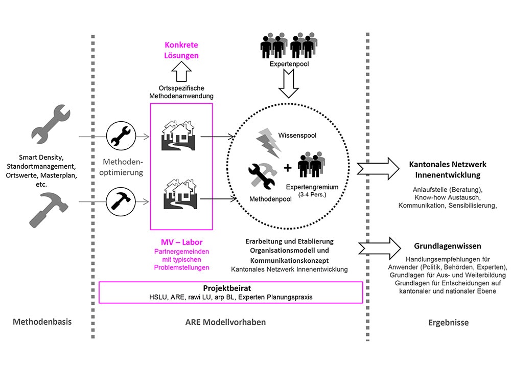 Im Rahmen des Modellvorhabens hat die Hochschule Luzern in Zusammenarbeit mit der Dienststelle Raum und Wirtschaft des Kantons Luzern und dem Amt für Raumplanung des Kantons Basel-Landschaft ein Vorgehensmodell für eine lokalspezifische Quartierentwicklung erarbeitet. Das Projekt fokussierte auf die kooperative Umsetzung von Innenentwicklungsstrategien mit der betroffenen Grundeigentümerschaft. Damit sollten strategisch wichtige Entwicklungsgebiete deblockiert werden. Die Projektbeteiligten haben anhand der Gemeinden Ballwil, Emmen, Entlebuch, Schüpfheim, Ufhusen, Weggis, Aesch und Oberwil Fallstudien durchgeführt und mehrstufige Lösungsansätze entwickelt.