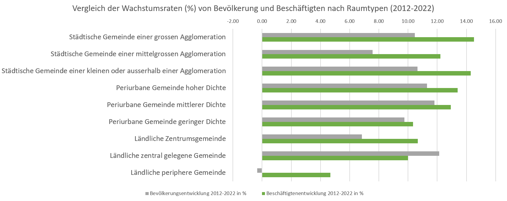 Im Zeitraum 2012-2022 ist in der Schweiz die Bevölkerung um 9.7% angestiegen, die Beschäftigten – beziehungsweise die Arbeitsplätze; die Begriffe werden hier synonym gebraucht – um 13.1%. Auch bei den verschiedenen Raumtypen lagen die Wachstumsraten meist höher, in den städtischen Agglomerationsgemeinden sogar deutlich höher als bei der Bevölkerung. Einzige Ausnahme: In den «ländlichen zentral gelegenen Gemeinden» (meist Gemeinden im ländlich geprägten Mittelland ausserhalb direkter Einzugsgebiete grösserer Städte und Agglomerationen) lag das Bevölkerungswachstum über dem Wachstum der Beschäftigten.