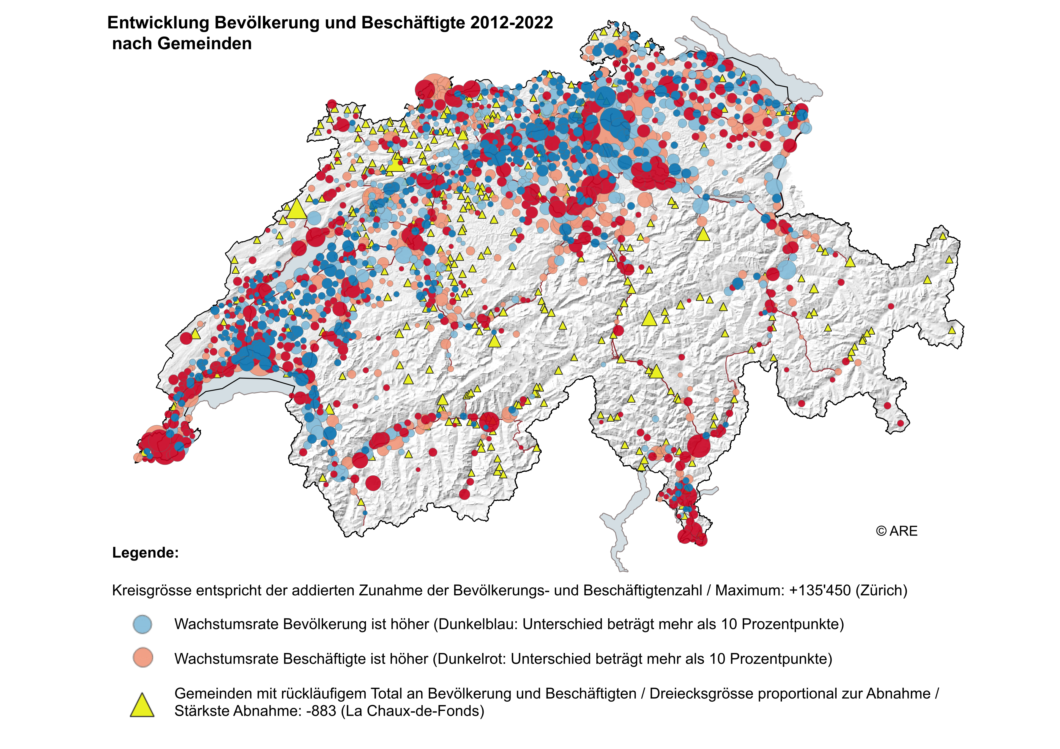 In welchen Regionen wuchsen vor allem die Bevölkerung und in welchen die Arbeitsplätze?Die Karte zeigt pro Gemeinde die Summe der Zunahme von Bevölkerung und Beschäftigten zwischen 2012 und 2022. Die Kreisgrösse zeigt, wie stark diese Zunahme war (Maximalwert: Zürich mit +135’450). Gemeinden, in denen Bevölkerung und Beschäftigte in der Summe rückläufig waren, sind mit gelben Dreiecken markiert – je stärker der Rückgang, desto grösser auch hier das Symbol. Die höchste Abnahme verzeichnete La Chaux-de-Fonds (-883).