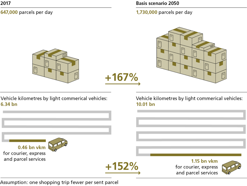 In Transport Outlook 2050, the assumption was made that one parcel shipment corresponds to one shopping trip not made. An increase in the number of parcels was determined for each scenario based on the reduction of shopping trips. Delivery traffic on the roads increases in proportion to the decrease in shopping trips. This means, for example, that ten per cent more parcels result in nine per cent more courier, express and parcel services trips.