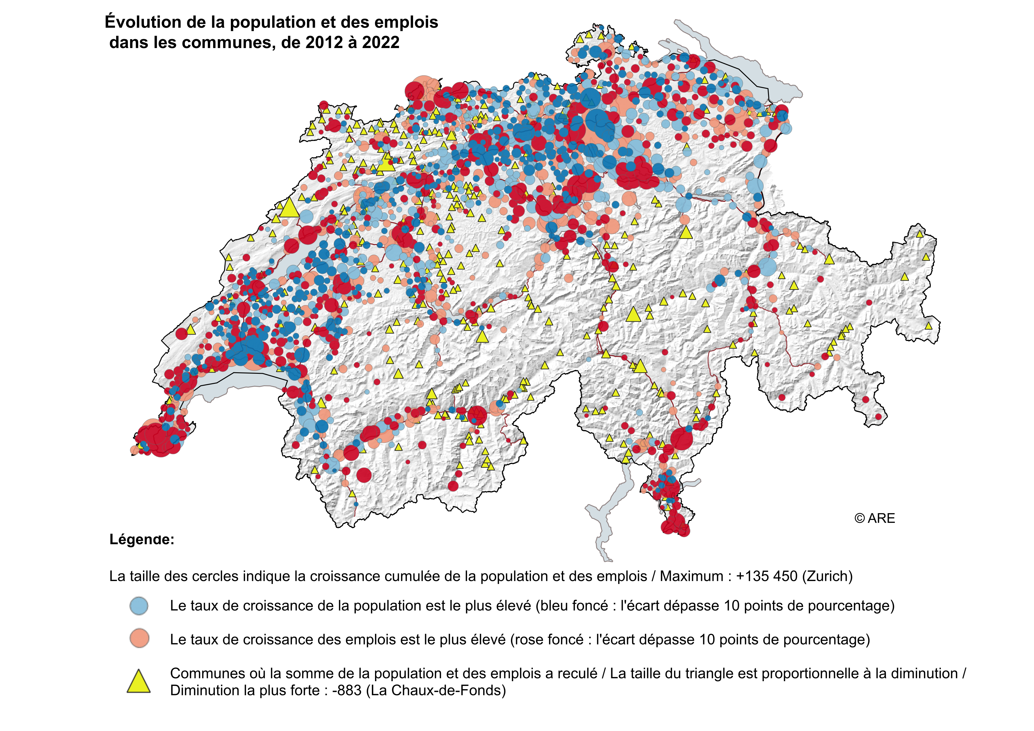 En 10 ans, de 2012 à 2022, la population suisse a augmenté d’environ 10 % et le nombre d’emplois a même augmenté de 13 %. Les zones rurales, en particulier celles situées en périphérie, ont connu une croissance inférieure à la moyenne. Les communes où la population a augmenté davantage que les emplois se situent pour la plupart dans l’ouest du Plateau ainsi que dans l’agglomération zurichoise. À l’inverse, les communes dans lesquelles c’est surtout la croissance des emplois qui a été forte se trouvent autour des agglomérations urbaines, mais parfois aussi de manière isolée dans l’espace rural.