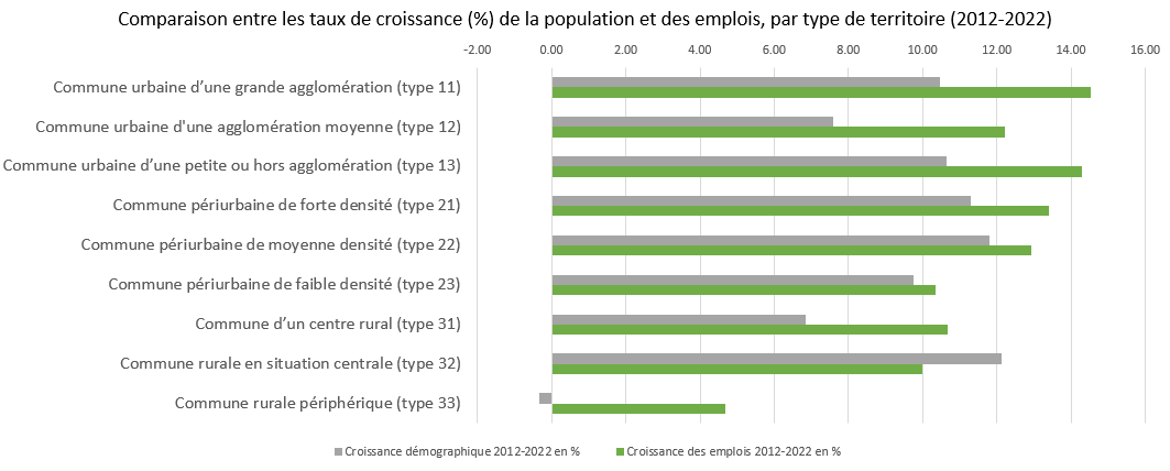 De 2012 à 2022, la population de la Suisse a augmenté de 9,7 %, tandis que le nombre d’emplois (ou de places de travail, les deux termes étant ici employés de manière équivalente), s’est élevé de 13,1 %. Dans les différents types d’espaces également, les taux de croissance de l’emploi étaient généralement plus élevés, et même nettement plus élevés que les taux de croissance de la population dans les communes urbaines d’agglomération. Seule exception : dans les communes rurales en situation centrale (généralement des communes du Plateau à dominante rurale situées en dehors des zones de desserte directe des grandes villes et agglomérations), la croissance démographique a été supérieure à celle de l’emploi.