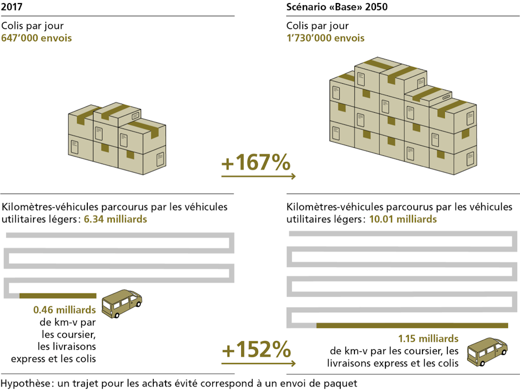 Dans les perspectives d’évolution du transport 2050, il a été présumé que chaque trajet en moins pour aller faire des courses serait remplacé par un envoi de colis. À partir des hypothèses portant sur la réduction des trajets d’achats, une croissance des colis a été calculée pour chaque scénario. Le trafic de livraison sur les routes augmente lui aussi proportionnellement au recul de ces trajets d’achats. Il en résulte par exemple qu’une hausse de 10% des colis entraîne 9% de courses en plus pour le segment des livraisons de colis et des coursiers.