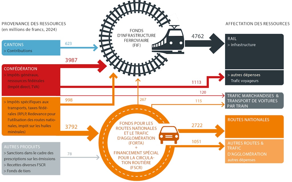 Presque 50 % des moyens proviennent du budget ordinaire de la Confédération, environ 30 % des recettes de l’impôt sur les huiles minérales (surtaxe incluse) et environ 10 % des recettes de la redevance sur le trafic des poids lourds liée aux prestations (RPLP). Chaque année, le montant utilisé pour les routes nationales atteint presque 3 milliards de francs tandis que le réseau ferroviaire coûte près de 6 milliards de francs. Le reste va avant tout aux autres routes, à la protection de l’environnement, au trafic marchandises et au trafic d’agglomération.