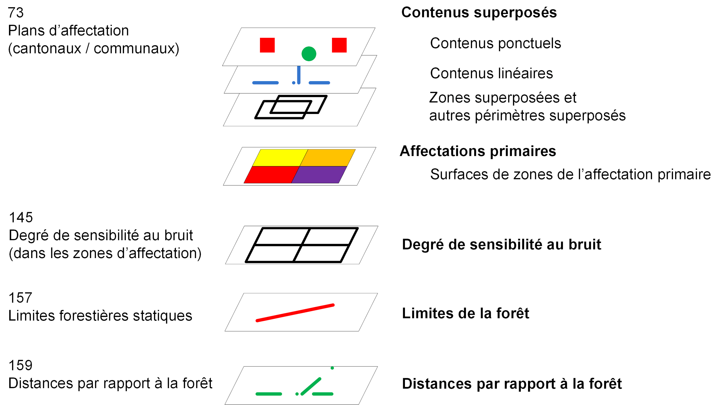 L'ordonnance classe les jeux de géodonnées de base qui relèvent du domaine des plans d'affectation dans le cadastre des restrictions de droit public à la propriété foncière (cadastre RDPPF). A l'instar du jeu de données no 73, les jeux no 145, 157 et 159 sont aussi définis dans le cadre de la procédure de planification de l'affectation du territoire. C'est la raison pour laquelle ils ont été intégrés dans cette modélisation des données, d'entente avec l'Office fédéral de l'environnement (OFEV).