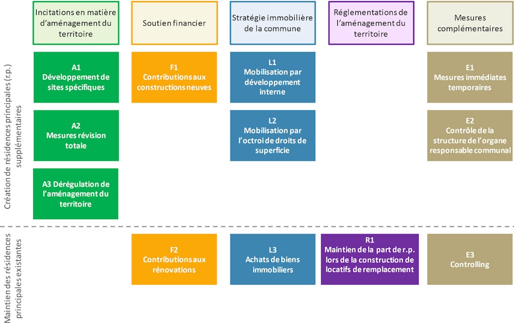 - Mesures d’aménagement du territoire : prescriptions sur les zones/plan d’affectation spécial ; contingentement ; zone hôtelière avec ou sans quotas de résidences secondaires ; restriction des possibilités de changement d’affectation.