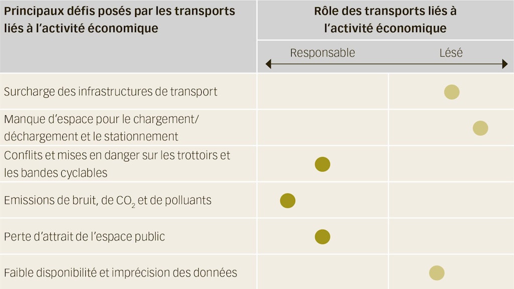 Les transports liés à l’activité économique sont souvent perçus par la population comme gênants. Ce sujet n’a dès lors pas été considéré comme une priorité par la population et par les politiques jusqu’ici, bien qu’il revête une importance centrale pour l’économie et pour la société. Dans le même temps, les transports liés à l’activité économique génèrent des nuisances pour le système de transport, la société et l’environnement. Les défis à relever doivent donc être envisagés de manière nuancée, afin qu’une réponse adaptée leur soit trouvée.