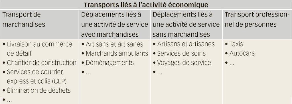 Le transport lié à l’activité économique comprend tous les déplacements dans un but commercial ou professionnel effectués pour le compte d'entreprises privées ou d’institutions publiques.. L'objet du voyage doit avoir un caractère professionnel, mais les trajets réalisés pour se rendre sur le lieu de travail sont explicitement exclus.