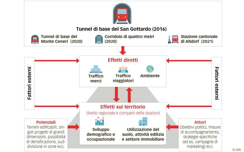 Il sistema di analisi si basa sul cosiddetto “Tripod”, un modello sviluppato dall’ARE nell’ambito della serie di studi «Effetti territoriali delle infrastrutture di trasporto » (EIT). Il Tripod combina dati quantitativi e informazioni qualitative e permette di spiegare come e perché si verificano o meno gli effetti territoriali analizzati. È in grado di identificare e rappresentare le interdipendenze tra trasporti, potenziali e attori e di evidenziare come si manifestano i cambiamenti nel territorio. Il Tripod si basa sull’interazione tra vari fattori in quanto presuppone che un modello di correlazioni lineari tra trasporti e territorio non tiene conto della complessità delle interdipendenze.
