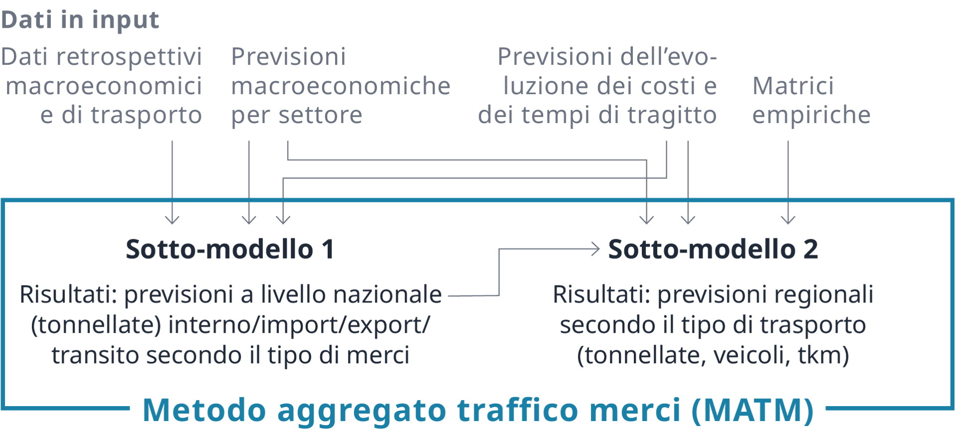 Il MATM è stato sviluppato per le prospettive di evoluzione del trasporto 2040 e attualizzato successivamente per quelle del 2050. Questo strumento prospettico è diviso in due sotto-modelli. Il primo permette di stimare il numero delle tonnellate di merci che saranno trasportate in Svizzera, per esempio tra 20 o 30 anni. Queste previsioni sono differenziate secondo 10 tipi di merci e secondo il tipo di trasporto (interno, import, export o transito). Sono ottenute sulla base di previsioni economiche, applicando delle relazioni statistiche osservate nel quadro dei dati retrospettivi.