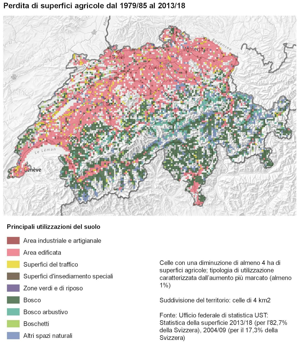 Da decenni in Svizzera si registra una perdita continua di terreno coltivo, pari a circa un metro quadrato ogni secondo. Nell’Altipiano questo fenomeno è riconducibile soprattutto all’incessante crescita dell'urbanizzazione. Nelle regioni di montagna, invece, la recessione dell’attività agricola determina crescenti fenomeni di incespugliamento e di rimboschimento.