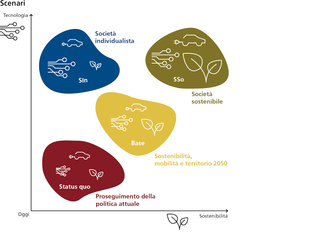Per le Prospettive di traffico 2050 sono stati calcolati quattro scenari diversi. Uno dei principali motori è lo sviluppo tecnologico, ad esempio attraverso veicoli automatizzati, offerte volte a combinare i mezzi di trasporto o veicoli elettrici. Un altro è il fatto che la politica e la società sono disposte ad agire maggiormente a favore di una mobilità sostenibile.